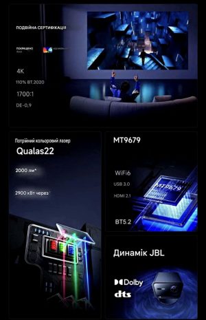 Проектор Vidda C2S – це нове покоління 4К лазерних проекторів. Завдяки новій технології потрійного кольорового лазеру (Triple Color Laser), цей проектор має саме широке кольорове охоплення (110% BT.2020). Яскравість, контрастність, палітра кольорів – це все на найвищому рівні! Проектор Vidda C2S має два професійні сертифіковані режими зображення IMAX ENHANCED та FILMMAKER MODE. Завдяки потужному процесору від MediaTek 9679 проектор має високу продуктивність та швидку обробку зображення. Також є інтерфейси USB 3.0, HDMI 2.1, SPDIF, бездротові модулі Wi-FI 6, Bluetooth 5.2., та вбудовані динаміки від JBL (2*10 Вт), які забезпечують якісне та об’ємне звучання.