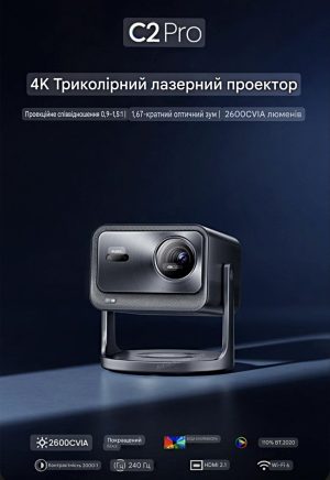 Проектор Vidda C2 Pro – це нове покоління флагманських 4К лазерних проекторів. Завдяки новій технології потрійного кольорового лазеру (Triple Color Laser), цей проектор має саме широке кольорове охоплення (110% BT.2020). Яскравість, контрастність, палітра кольорів – це все на найвищому рівні! Проектор Vidda C2 Pro має два професійні сертифіковані режими зображення IMAX ENHANCED та FILMMAKER MODE, оптичний зум 0.9-1.5, який дозволяє зменшити або збільшити зображення, без втрати якості. Завдяки потужному процесору від MediaTek 9679 проектор має високу продуктивність та швидку обробку зображення. Також є інтерфейси USB 3.0, HDMI 2.1, SPDIF, бездротові модулі Wi-FI 6, Bluetooth 5.2., та вбудовані динаміки від JBL (2*10 Вт), які забезпечують якісне та об’ємне звучання.