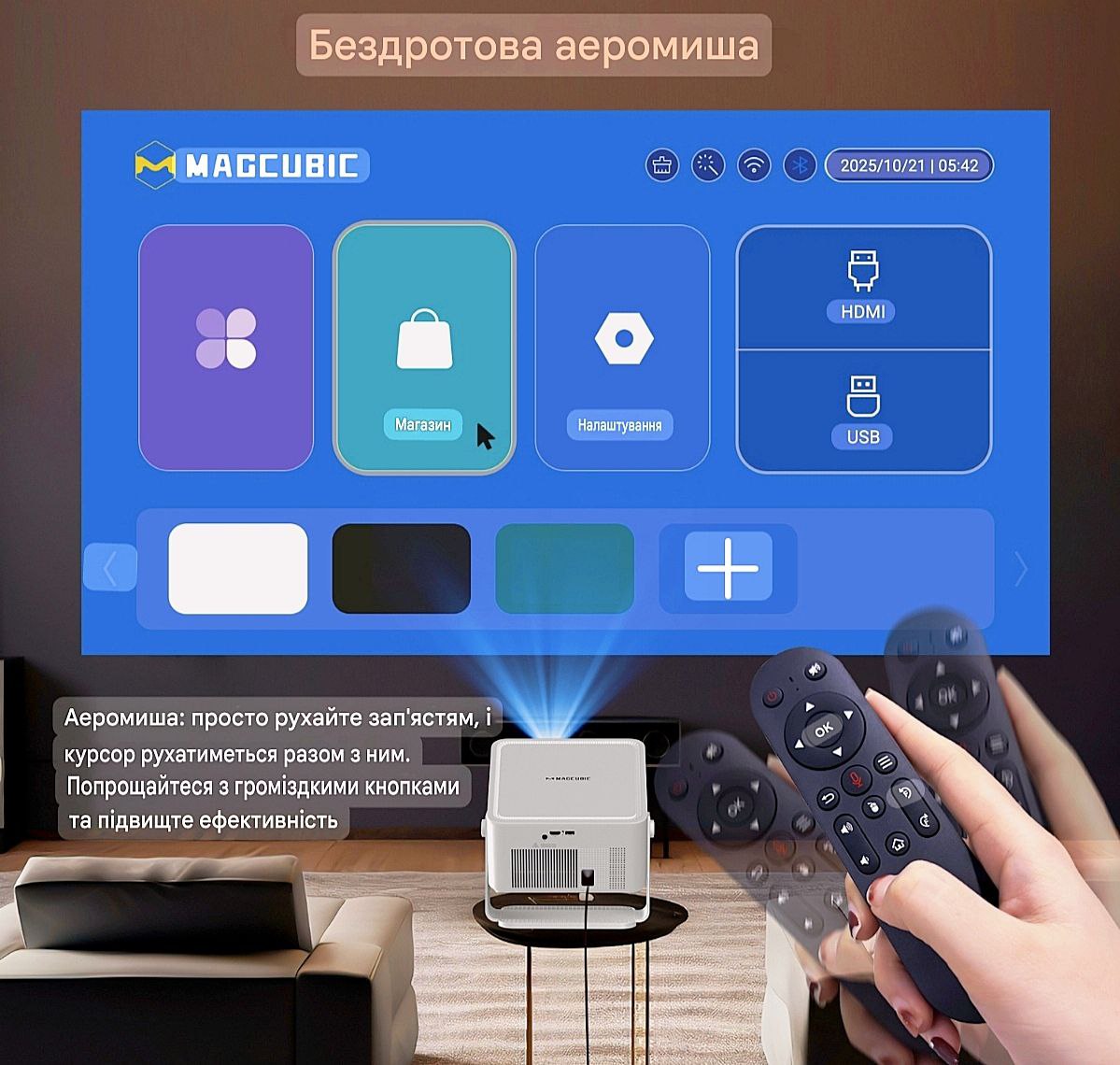 Magcubic HY450MAX – це сучасний портативний LED-проектор, який перетворює будь-яке приміщення на повноцінний домашній кінотеатр. Завдяки яскравості до 1100 ANSI люмен, нативній роздільній здатності Full HD 1080p та підтримці відео до 4K/8K, ви отримуєте чітке, насичене зображення навіть у напівосвітленій кімнаті. Пристрій працює на базі Android 14, що дозволяє встановлювати популярні програми (YouTube, Netflix, Megogo і т.д.) та використовувати проектор як повноцінний Smart TV без додаткових приставок. Ідеально підходить для: перегляду фільмів та серіалів, YouTube, IPTV, ігор на великому екрані, презентацій та підключення смартфона чи ноутбука.